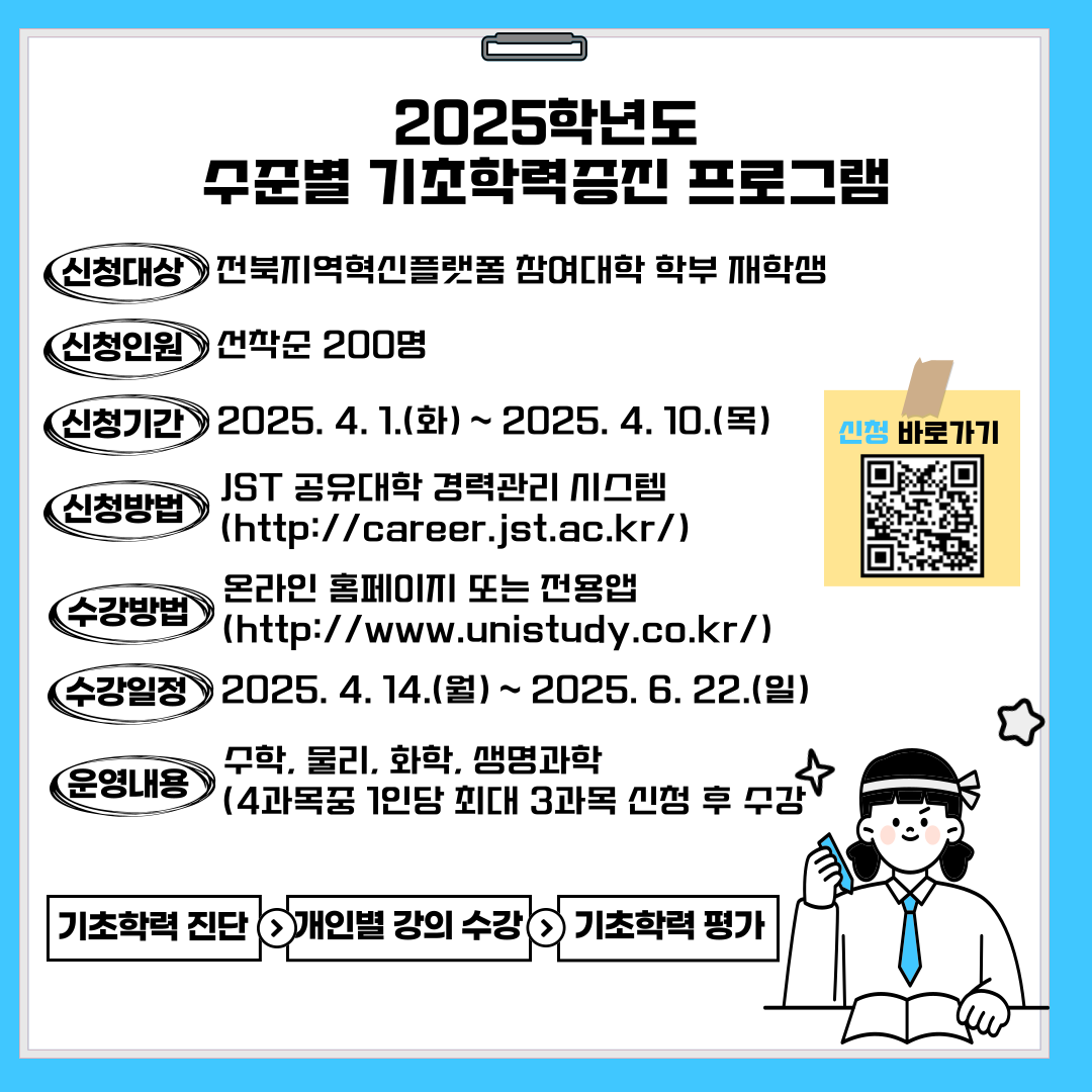 기초학력 진단 (사전진단) | → | 개인별 강의 수강 | → | 기초학력 평가 (사후평가) | → | 결과 보고 |